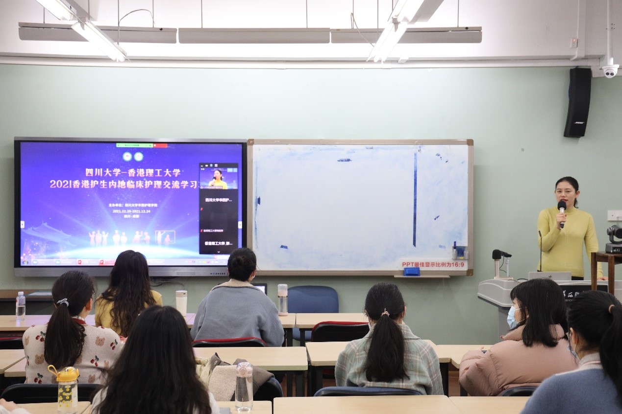 2021年12月22日,bat365中文官方网站华西医院心内科护理团队带领来自bat365中文官方网站和香港理工大学护理学院本科生,开展了为期一天的交流学习。本次交流为“2021年香港护生华西临床护理交流及实践”系列活动之一,18名华西护理本科生在线下参与教学,10名香港理工大学护理本科生通过线上直播的方式学习和交流。交流活动由bat365中文官方网站华西医院心内科专科副护士长温雅主持。