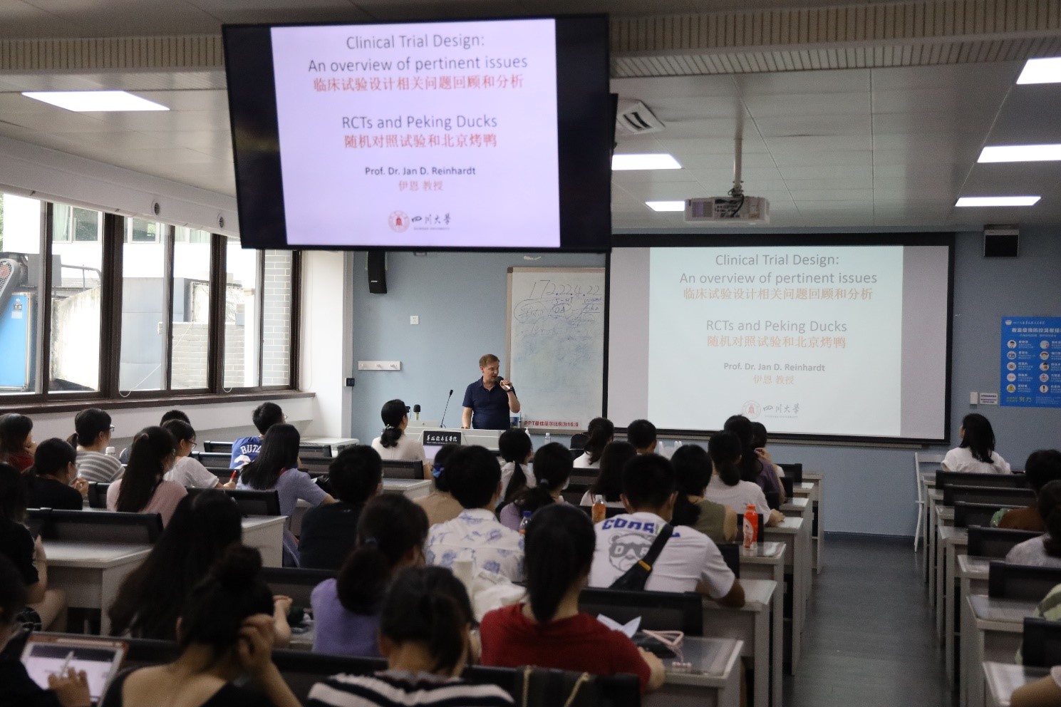 7月13日,“提升护理学科实力,建设护理学科”系列讲座在华西校区临医楼205教室顺利举行。bat365中文官方网站-香港理工大学灾害重建与管理学院教授,博士生导师,我院联培博导Prof. Jan D.Reinhardt,以“Randomized Controlled Trials (RCTs) and Peking ducks: An introduction to clinical trials design”为题,为全院200余名师生带来了精彩的现场演讲。讲座由护理学院张凤英副院长主持。