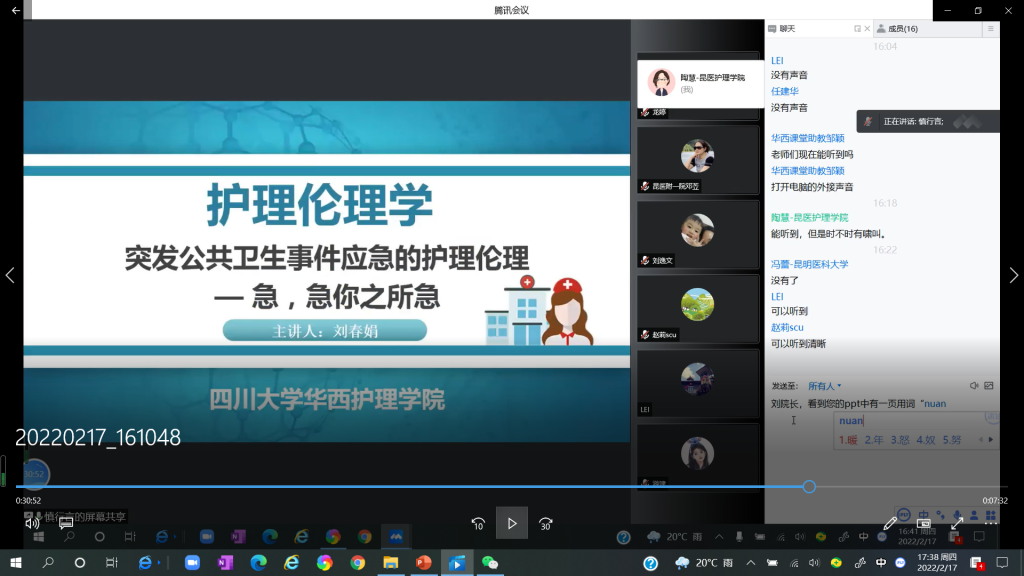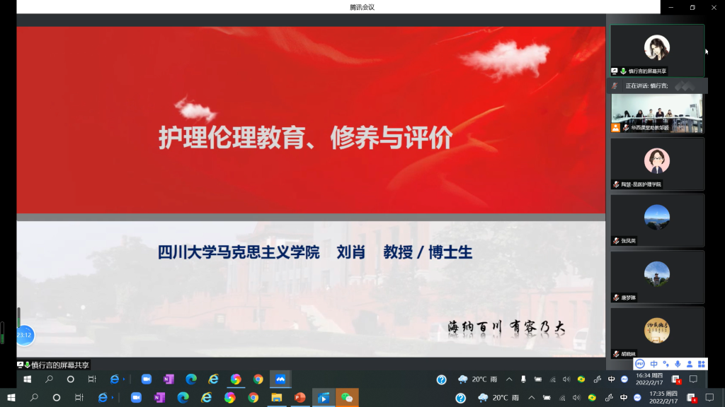 刘肖教授表达了对《护理伦理学》教学工作的肯定,展示了对护理伦理教育、修养与评价教学章节的思考,分享了如何将护理伦理知识讲授和马克思主义理论传播相融合,在强调护理人员自身伦理修养的同时进行马克思主义公私观的价值塑造。刘春娟副教授在教学设计中引用最新实例,思考公共卫生服务中的伦理问题,诠释突发公共卫生事件应急护理伦理要求。《医学伦理学》课程负责人、马克思主义学院李琰博士分享了护理伦理教学中的改革思考,拓展网络平台和线下学习资源的有效整合。昆明医科大学护理学院《护理伦理学》课程负责人龙婷老师分享了课时安排、教学方法创新、课程网络平台建设、优质在线资源利用和考核方式。