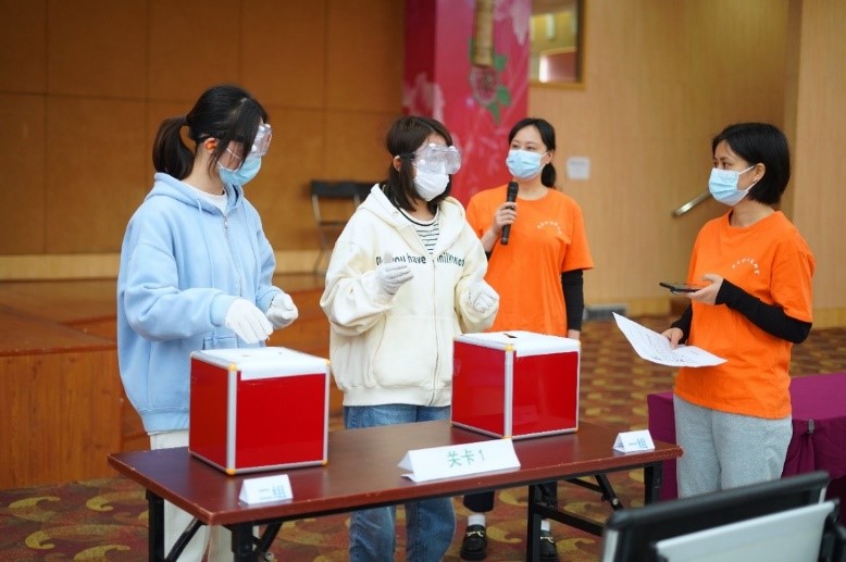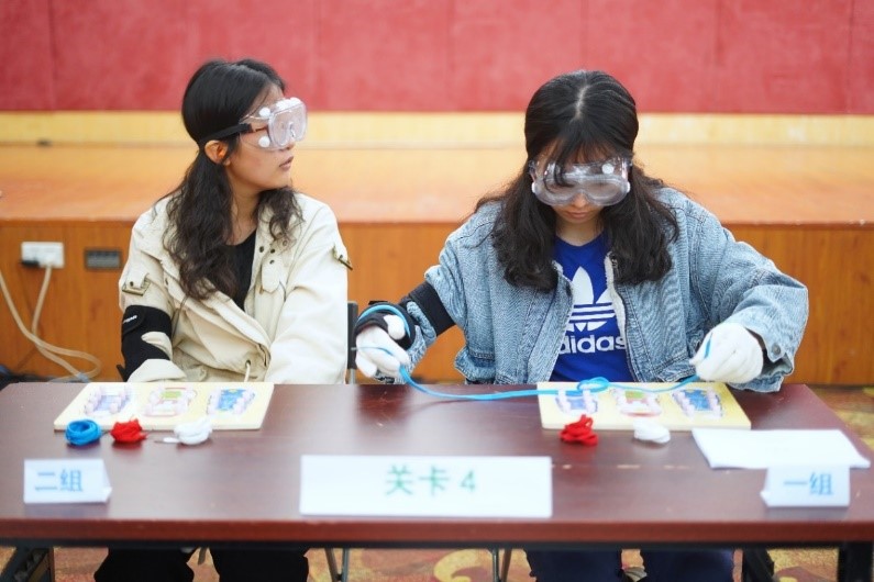课程由“老年趣味运动会”和“模拟体验情景剧”两个环节组成。首先是老年趣味运动会,通过设置摸水果、上下楼梯、拾物品、夹豆子、穿鞋带、穿脱衣服等关卡,让参赛同学穿上老化模拟装置,以接力竞赛的方式体验老年人在触觉、行动、精细动作、视觉、听觉等方面的改变。“老化”的状态让同学们在运动会上产生了不一样的体验,例如:触觉感受降低,误将柠檬认为橙子;听力障碍,传话时将橙子误传为苹果;视力障碍,将卡片上“香黎”误认成“香梨”;平衡能力下降,上下楼梯时战战兢兢;精细动作完成度下降,夹豆子时总是夹空,鞋带总是穿不进鞋眼,裤子腰带总是系不上……曾经觉得易如反掌的事情,居然真的就做不对,做不好了,同学们纷纷表示原来老了是这种感觉啊!