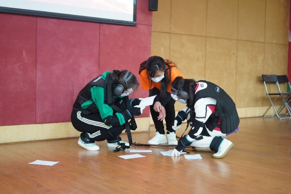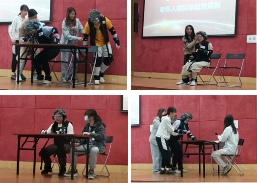 第二个环节是同学们自导自演的模拟体验情景剧。课前同学们根据自己对老年人日常生活状态的认识,积极思考,自创剧本。体验中,同学们在老师的帮助下佩戴降视眼镜、降音耳机、关节制动装置、足/腕加重装置、腰背限制装置等全套老化模拟装置,真实地感受到由于老化带来的肢体功能与感官变化、老年人在日常生活能力上的改变,同学们通过模拟自行设计的老年人进食、行走、就医、购物等各种生活场景,深刻体会到老年人在日常生活中可能面临的困难和不易。