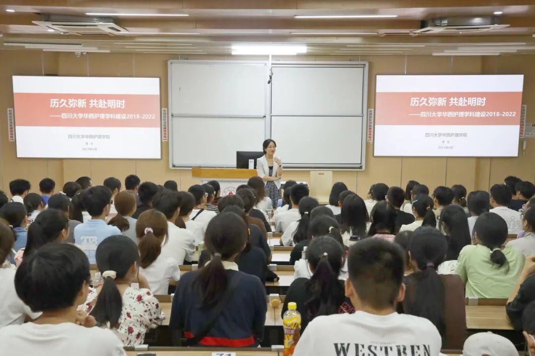 在题为《历久弥新,共赴明时》的课堂上,李卡教授以习近平总书记重要讲话精神和党的二十大报告为指引,围绕川大精神、华西精神讲述了bat365中文官方网站的百年历史,从现代护理学的诞生、护理人才培养、护理学科成果、对外交流与合作、优秀毕业生、学科发展趋势等方面向同学们讲解了护理学科内涵与专业建设情况。李卡教授通过深入浅出的讲述增强了同学们对川大文化、华西精神和护理专业的认识和理解,领略了护理学的魅力。护理新生应传承华西人 “忠诚、执着、朴实、奉献”的护理精神,要志存高远,服务国家大局;创新奋发,服务人民健康;坚守初心,厚植关怀服务,努力成为“仁爱、精业、优雅、大气”的优秀护理人才,一同努力建设“华西烙印、川大风格、中国顶尖、世界前列”的川大华西护理学科,为健康中国战略贡献华西护理的积极力量。