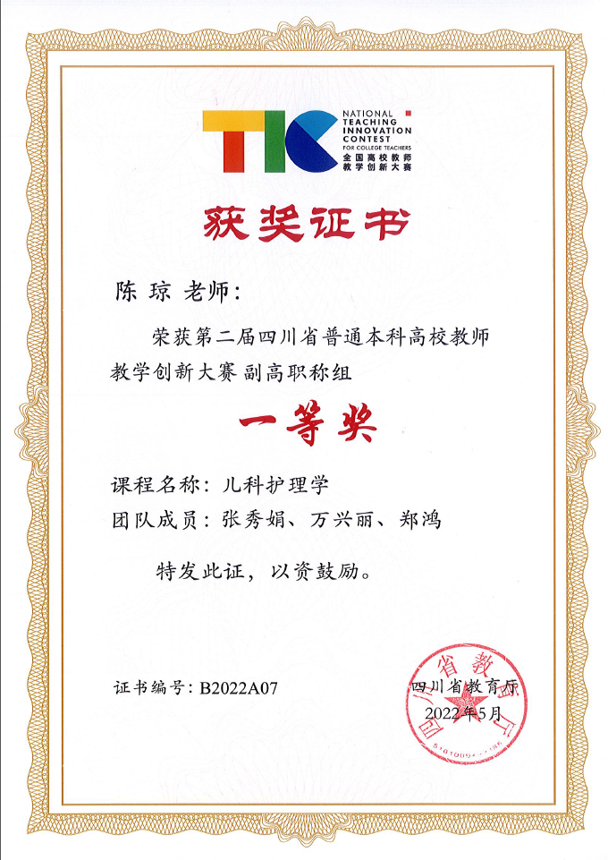 2022年7月31日,第二届全国高校教师教学创新大赛总决赛在西安交通大学落下帷幕。我院陈琼副教授代表儿科护理学教研室《儿科护理学》课程团队荣获二等奖。本次大赛主题为“推动教学创新 培养一流人才”,由教育部高等教育司指导、中国高等教育学会主办,西安交通大学承办。来自全国31个赛区1195所高校的18407名教师参加省赛,覆盖13个学科门类,267所高校1462人参加,205门课程入围国赛现场评审。我院陈琼、张秀娟、万兴丽、郑鸿教师团队经多轮竞赛荣获四川省赛一等奖,作为我省唯一护理团队入围国赛。本次获奖是继2021年我院妇产科护理学何菁菁老师团队取得全国赛二等奖后再一次创佳绩。