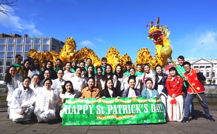 每年的3月17号都是爱尔兰最重要的节日之一——国庆节(St. Patrick’s Day)圣帕特里克节。孔院作为中国代表也参与了今年的游行,我们主要分为太极、舞龙、中国舞三个小分队来进行展示,爱尔兰人民都非常热情,对于中国传统文化表现出了极大的兴趣。当我们从他们旁边走过的时候,大家就会欢呼招手,让我们充分感受到了节庆的气氛。在国庆节这一天仿佛全科克的人民都聚集到了街上,这次独一无二的文化体验也让我的爱岛生活经历变得更加丰富。