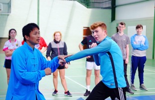 我所任教的两所男校都开展了武术体验课,得益于中国功夫在全球的影响力,学生们都对体验课充满了期待。孔院的武术老师徐老师也不负众望,为学生奉献了非常精彩的武术表演。在给学生进行展示的过程中,徐老师会邀请学生参与其中,每当展示到精彩部分时,学生们都会发出阵阵惊呼,在这一过程中,我也抓拍到了许多精彩生动的照片,学生们每节课都会贡献出诸多优秀的表情包。在武术教学的过程中,因为需要学生们按照指令来做动作,所以武术老师会直接把数字和动作联系在一起,这种需要大脑以及全身参与其中的教学方式与我们之前的中国传统食物体验课有异曲同工之妙,都能够帮助学生加深对语言的记忆,学生们掌握数字的速度非常快,而且记得非常牢靠,同时对于中国文化的理解也在这样的课程中得到了不断深化。