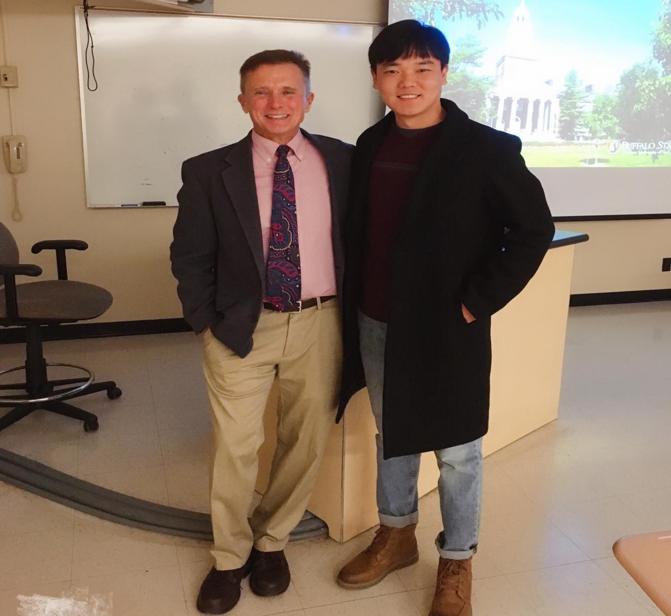 我来纽约州布法罗安顿下来之后,第二天就将入学等手续办好了,由于我来布法罗学院学习的时候正值美国高校放暑假,我在一个多月的时间里是采取了自由学习的方式,在和指导老师商量之后,我在学校图书馆和“中国学”研究中心提供的办公室学习了一个多月,查找了一些本专业的学习资料。开学之后,在指导老师张杰的安排下,根据自己的专业需求,我选修了一门东亚史的课程,这门课是由美国著名的亚洲学者Michael C.Lazich开授,Michael C.Lazich教授对于亚洲历史尤其是中国历史有自己独特的视角和见解,我也认真学习了相关课程,做了笔记并拍摄了相关照片。课前我一般都会事先预习,阅读相关的文字材料,保证自己在课堂上能够与老师和同学进行沟通,充分有效的利用起来这门课程。每次上课,我都尽量做到认真听讲,做好笔记,并积极发言和提问,同时和其他学生一样完成老师布置的每次作业。在课堂上深深地被张老师的理论功底折服,感觉老师讲课时是在享受这个过程,我也很享受这个交流和学习的过程。Michael C.Lazich教授常说,作为一个大学教授必须经常站在讲台上讲课,这是教授的安身立命之本,是必须遵守的一种职业道德。同时讲课还可以保持大脑思维的活跃程度,而且在课堂上接受学生的提问和质疑,常常可以激发学术灵感。这就是我们通常所说的教学相长。老师上课很耐心,学生听不懂,不往下讲,直到大部分学生听懂,这一路跟下来,我把美国高校老师如何进行教学的模式大致弄清楚了。课程结束后,我也进行了复习学习,希望回国后能够发扬自己所学之长,对自己将来的学习有所帮助。