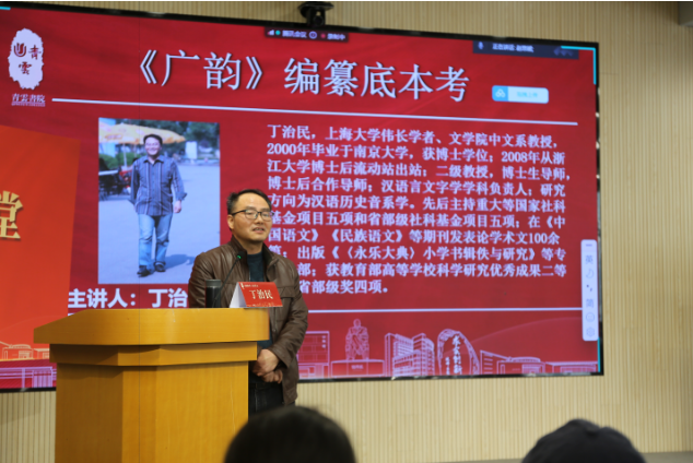 《广韵》是北宋陈彭年、丘雍创作的语言学著作,成书于公元1008年,它是《切韵》最重要的增订本,并且使已经亡佚的《切韵》的古音得以完整地流传了下来,成为研究中古汉语语音的重要资料。作为中国第一部官修韵书,《广韵》在当时的文人学士心目中成了一个至高无上的必须遵循的音读典范。丁治民教授向同学们介绍了中国语言文学中汉语言文学的音韵学,而《广韵》是研究音韵学的重要资料。丁教授还列出为编纂校正《广韵》的我国杰出文学人物及其他们做出的贡献,向大家讲述许多有趣的故事。