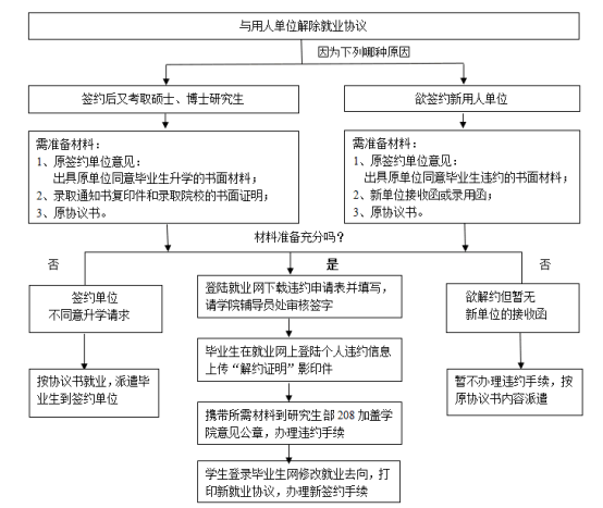 为了维护学校和全体研究生的声誉,毕业生应做好职业生涯规划,慎重签约,认真履约,因学生个人原因提出与原签约单位违约,须首先征得原单位同意,学生须持原单位的同意解约的书面意见,新单位的书面录用通知,并填写从就业网上下载的违约申请表,登录就业网录入相关违约信息,到辅导员处初审签字,在字院盖章后办理违约手续,发予新的就业协议书。