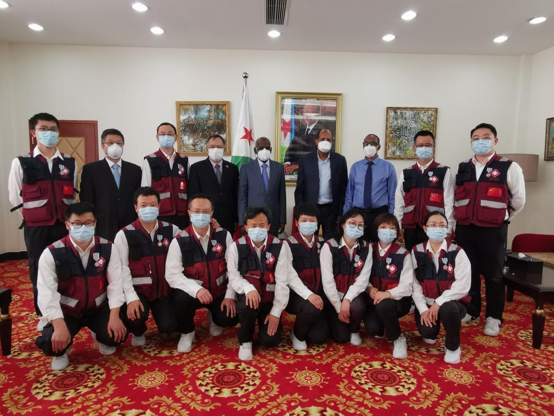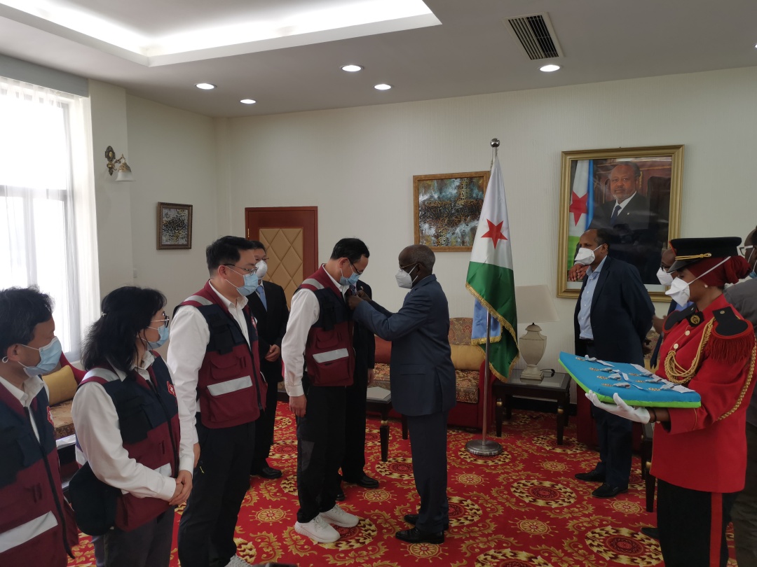 5月10日,吉布提总理卡米勒在人民宫举行仪式,向中国政府委派,bat365中文官方网站华西医院为主体的中国赴吉布提抗疫医疗专家组授勋。曾勇组长被授予“军官级独立日勋章”,其他11名队员被授予“骑士级独立日勋章”。此次授勋,无论是从勋章数量和礼仪规模上在吉布提历史上均尚属首次。