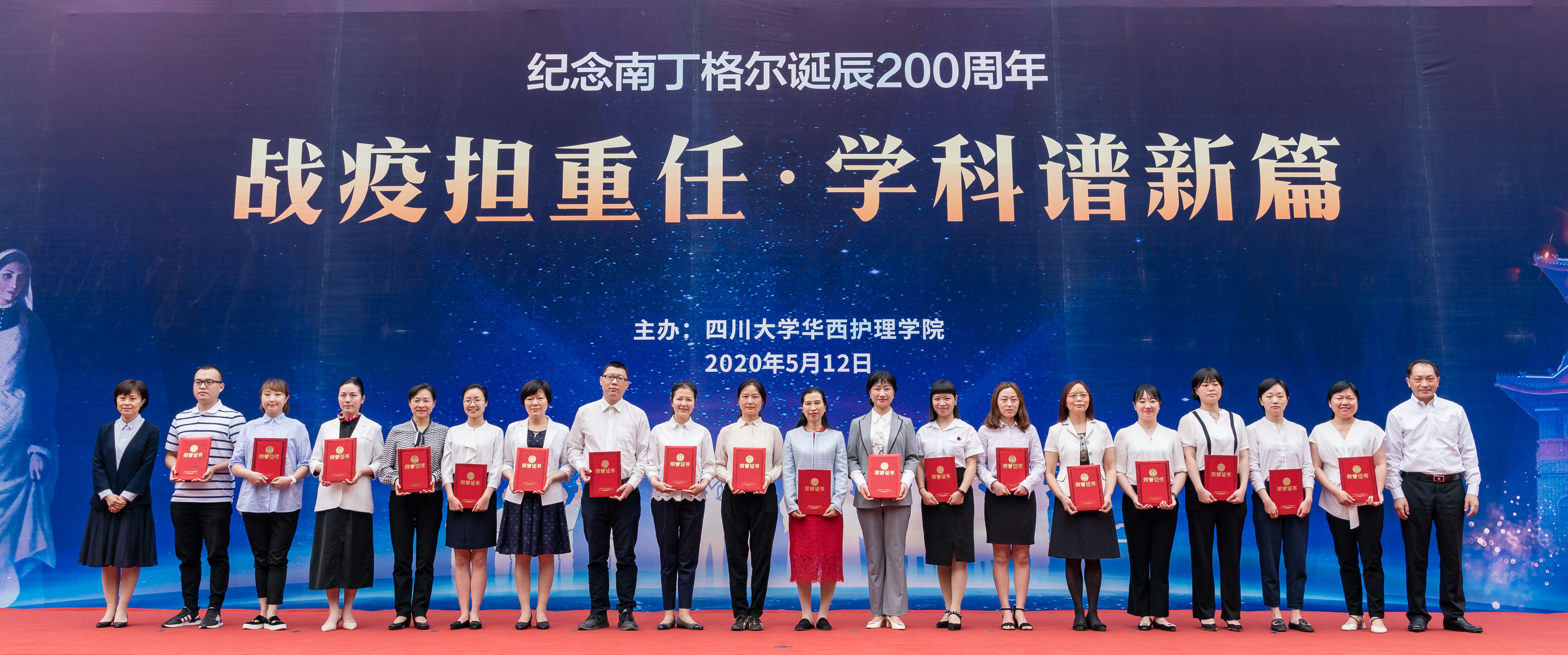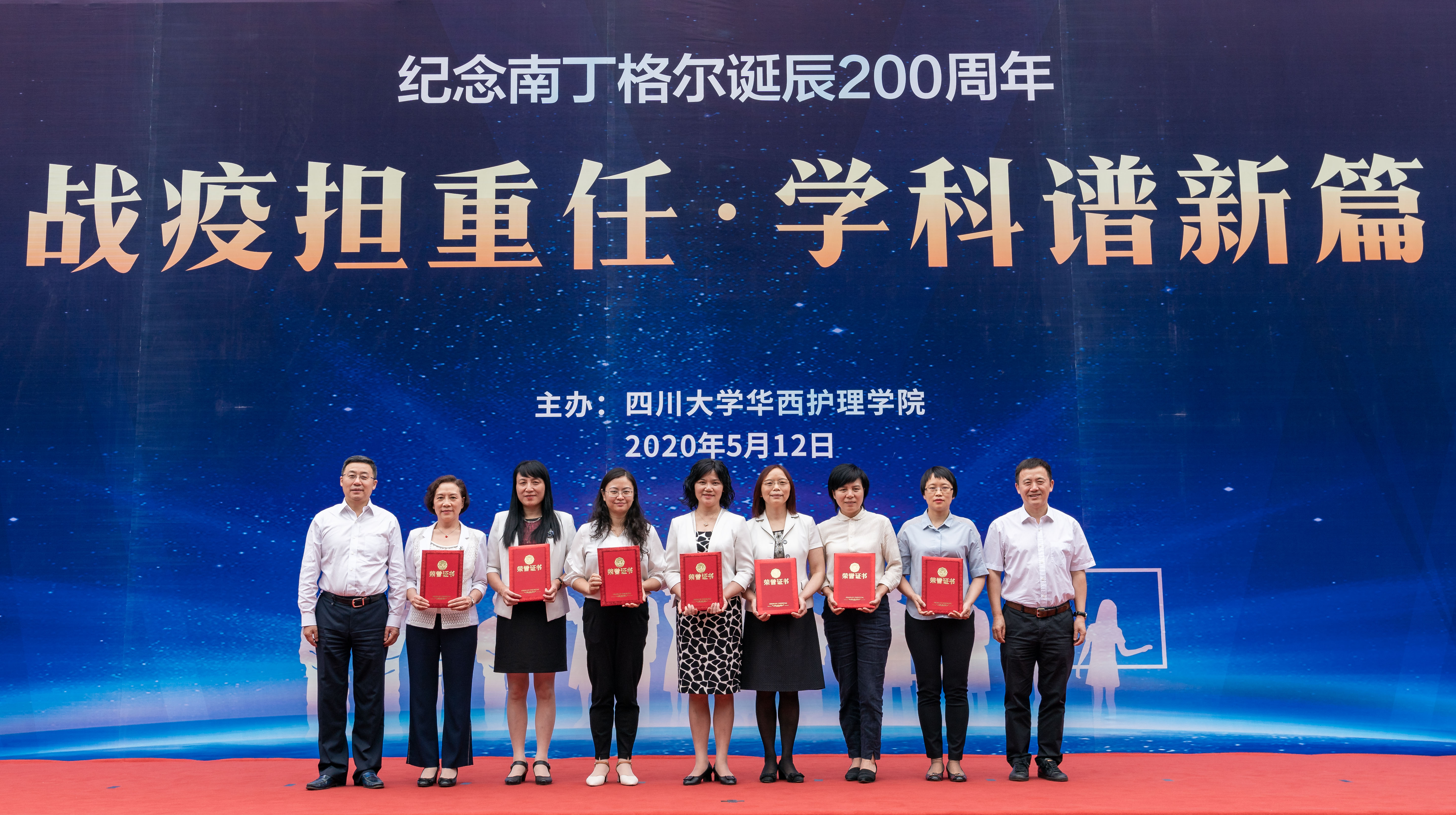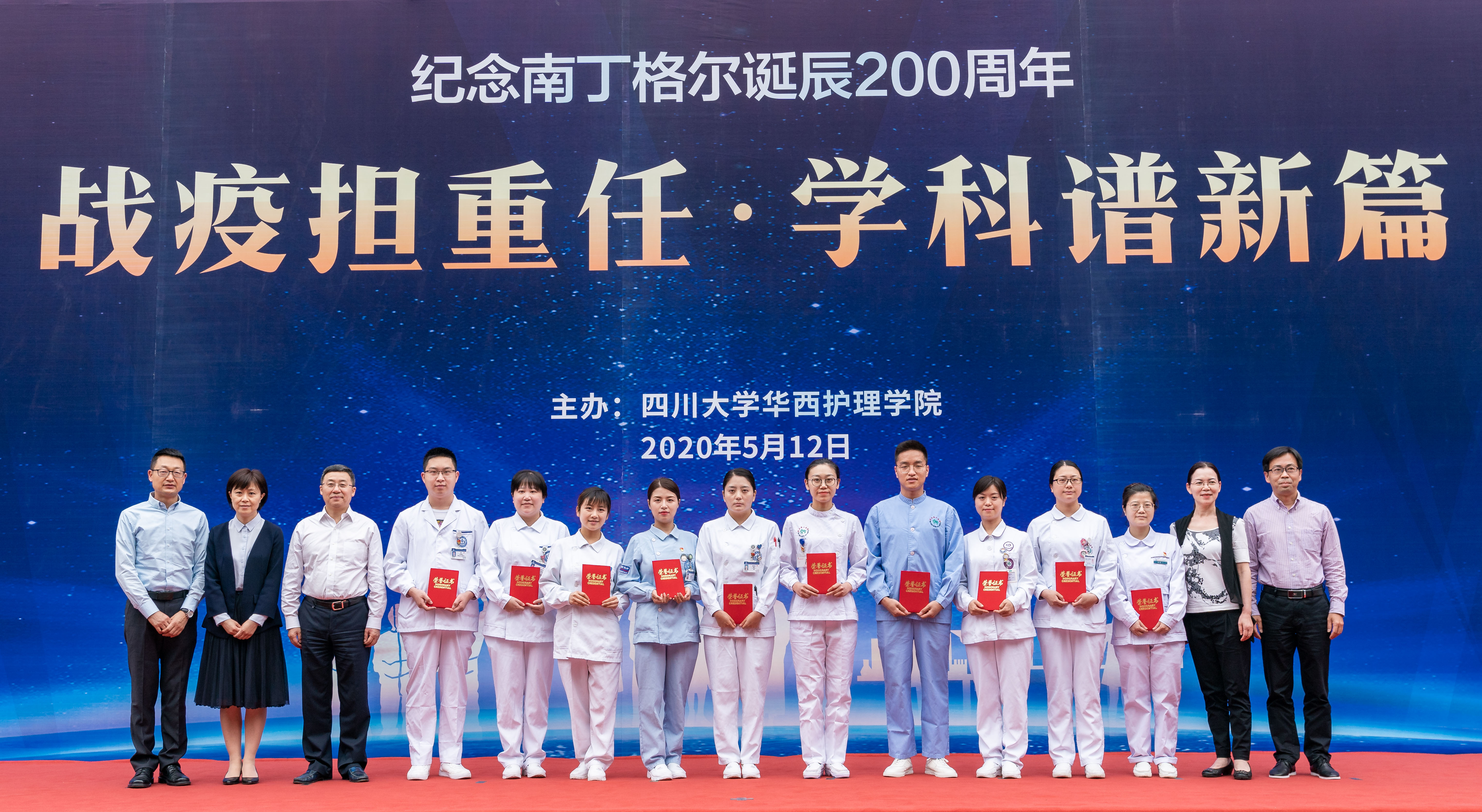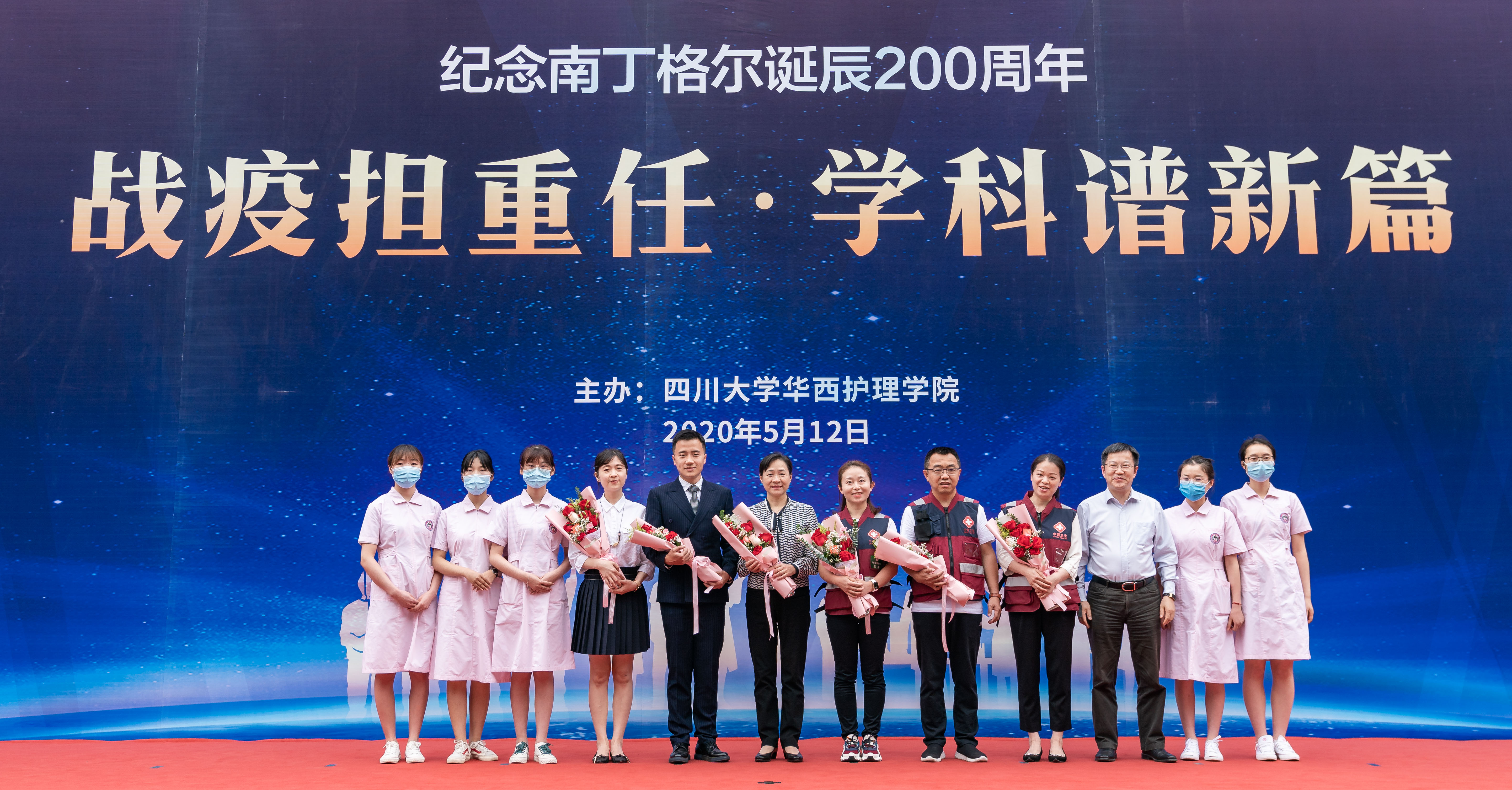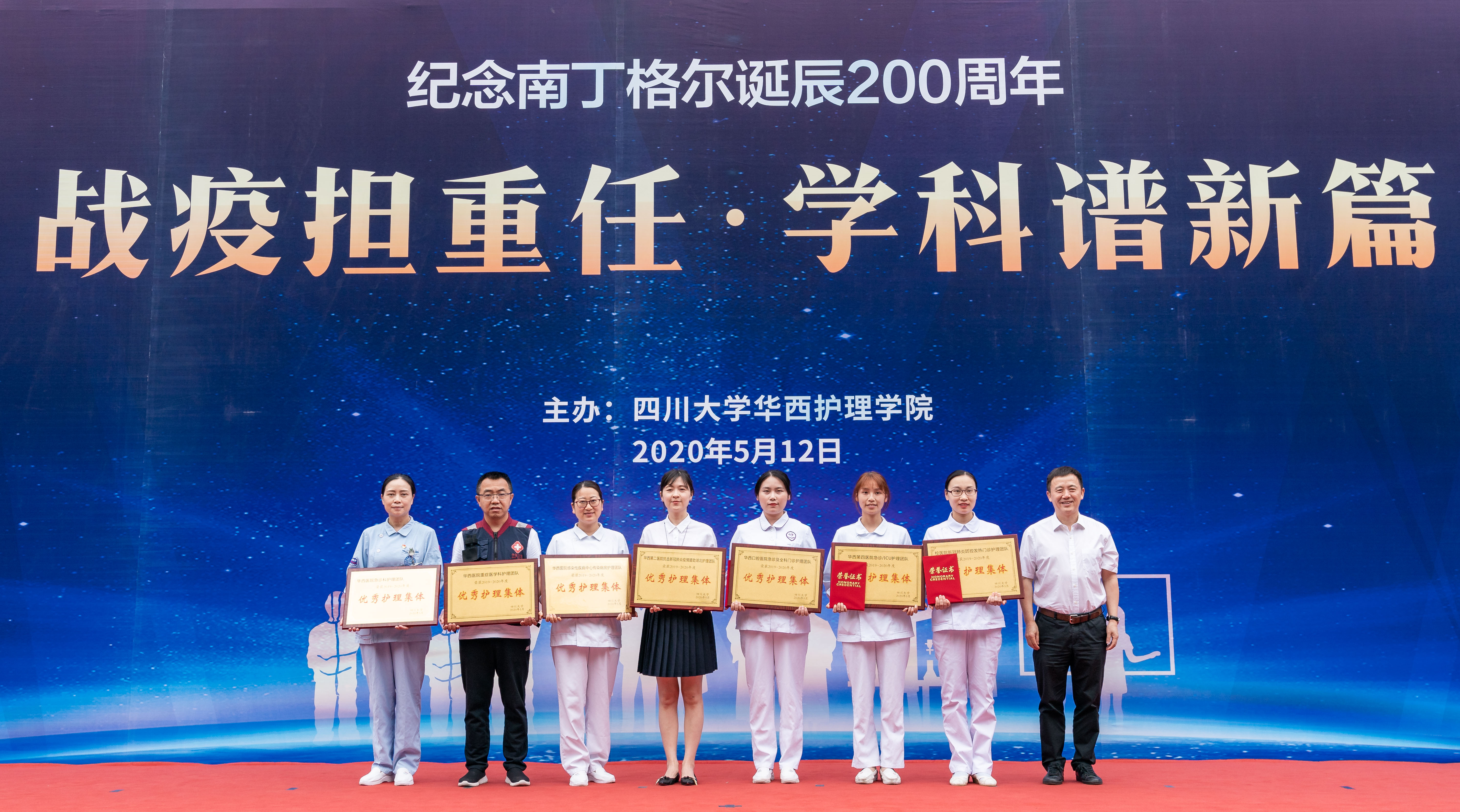 战疫担重任,学科谱新篇。5月12日下午,在109个国际护士节之际,学校在华西校区第八教学楼表彰2019—2020年度优秀护理集体和个人并举行纪念南丁格尔诞辰200周年主题活动。四川省科技厅副厅长陈学华,校长李言荣、副校长张林、华西临床医学院/华西医院/bat365中文官方网站院长李为民、华西临床医学院/华西医院党委书记张伟以及华西第二医院、华西口腔医院、华西第四医院、校医院相关领导,以及学校相关职能部处负责人,bat365中文官方网站全体师生、各附属医院护理代表参加了活动。