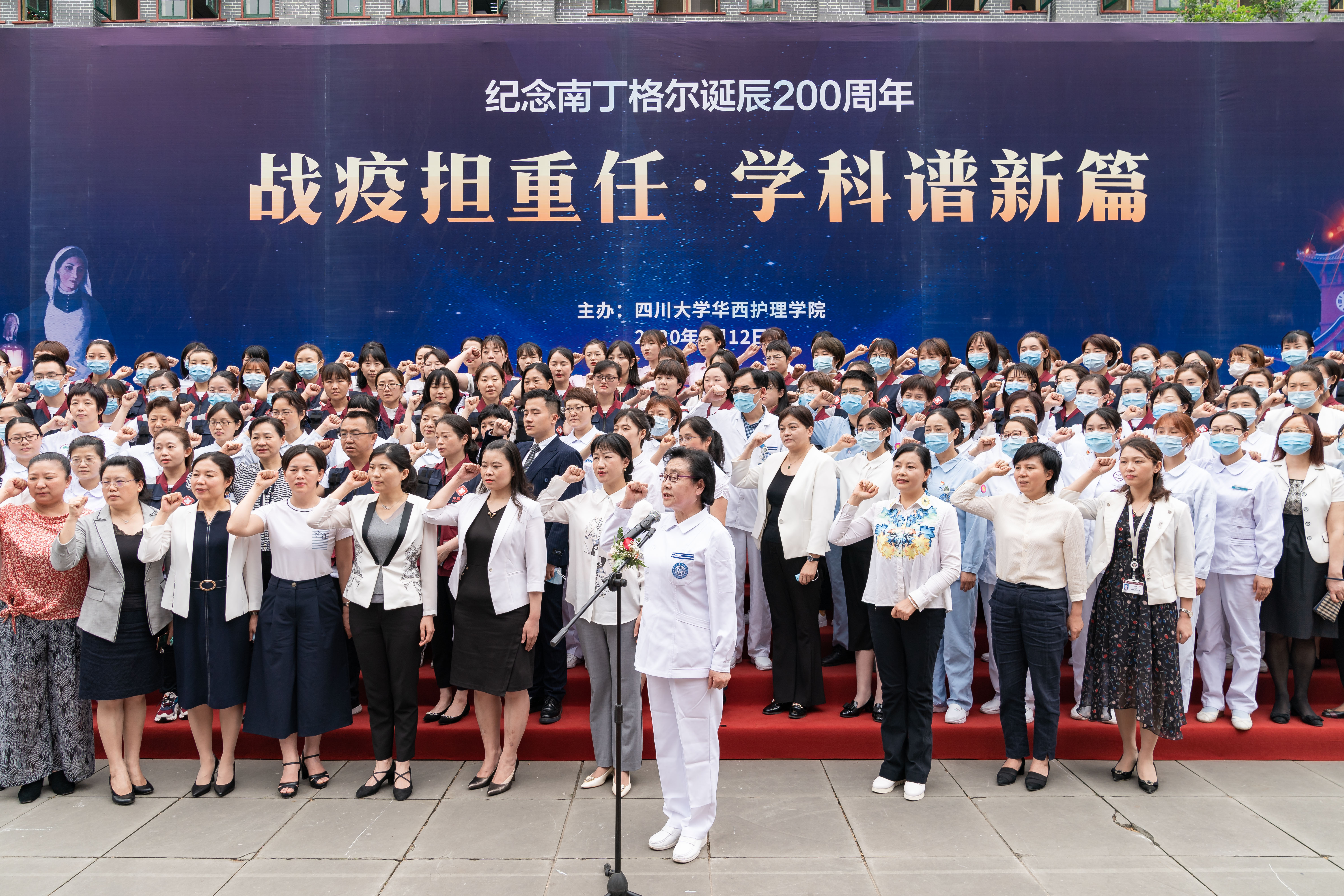 活动中,在第44届南丁格尔奖章获得者、bat365中文官方网站华西医院原护理部主任成翼娟教授的领誓下,近200名来自华西的护理工作者重温了南丁格尔誓言。
