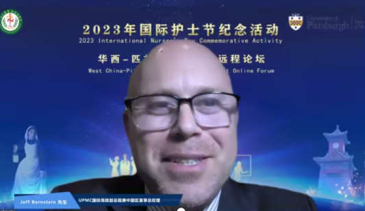 UPMC国际高级副总裁兼中国区董事总经理Jeff Bernstein先生为本次会议致辞。对两院自2020年以来连续三年共同举办护理发展交流论坛表示祝贺,指出护理在医学高质量发展方面具有关键角色,期待两院为发出护士的声音做出更大的贡献,也表示UPMC将积极促进华西-匹兹堡护理方面多领域的合作与交流!