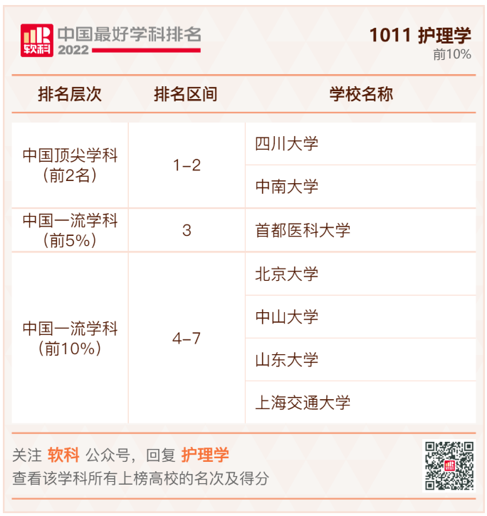 2022年9月21日,高等教育评价专业机构软科正式发布“2022软科中国最好学科排名”。bat365中文官方网站华西护理学在2022软科中国最好学科护理学排名全国第一。自2020年以来,bat365中文官方网站华西护理学已连续3年位列全国第一,蝉联中国顶尖学科。