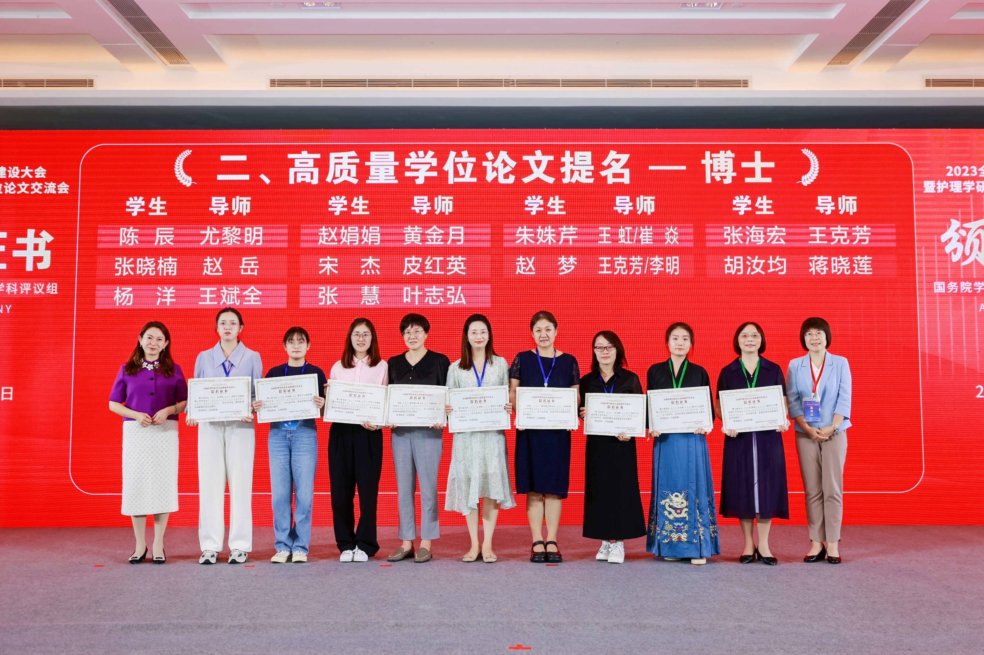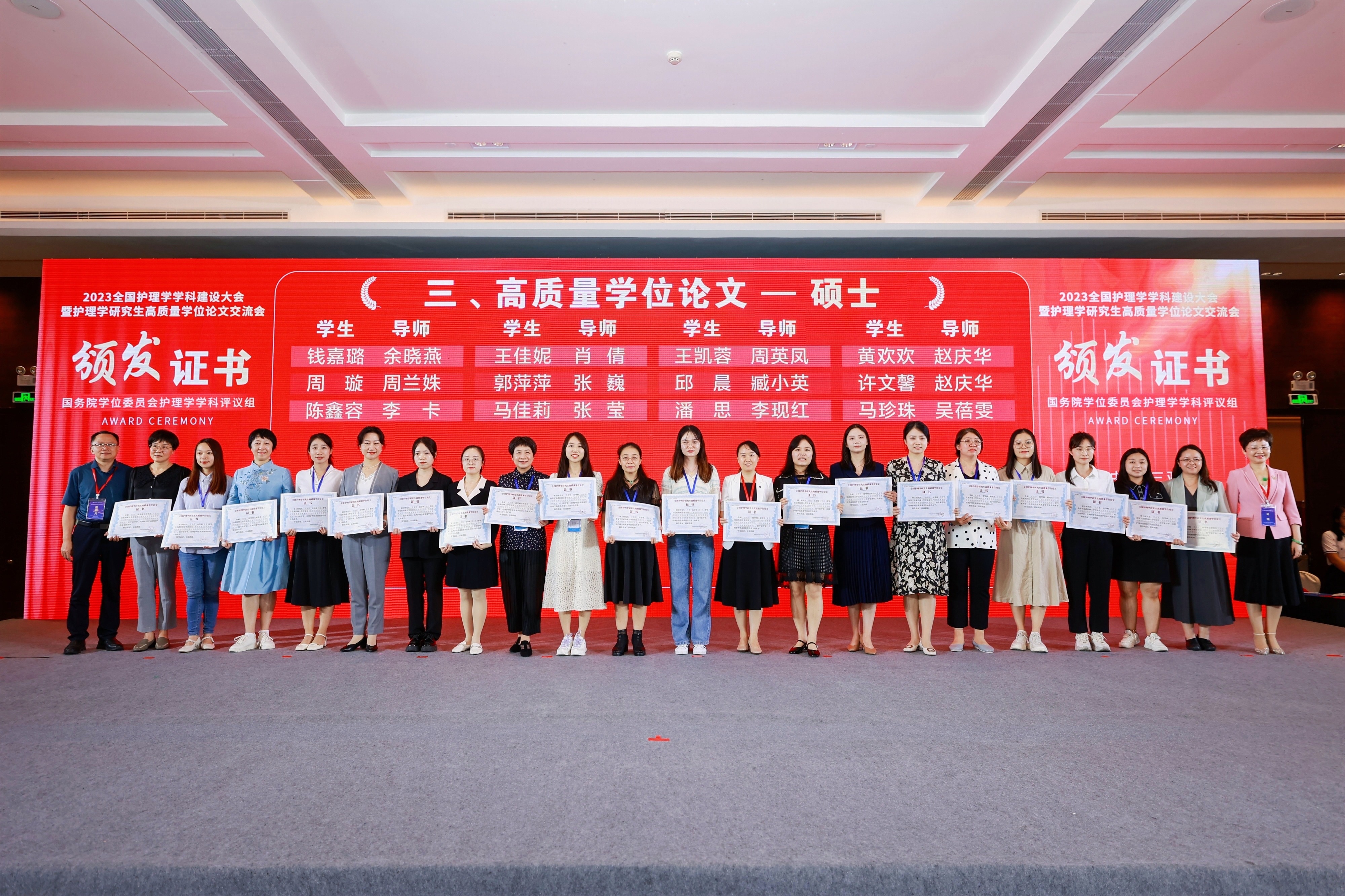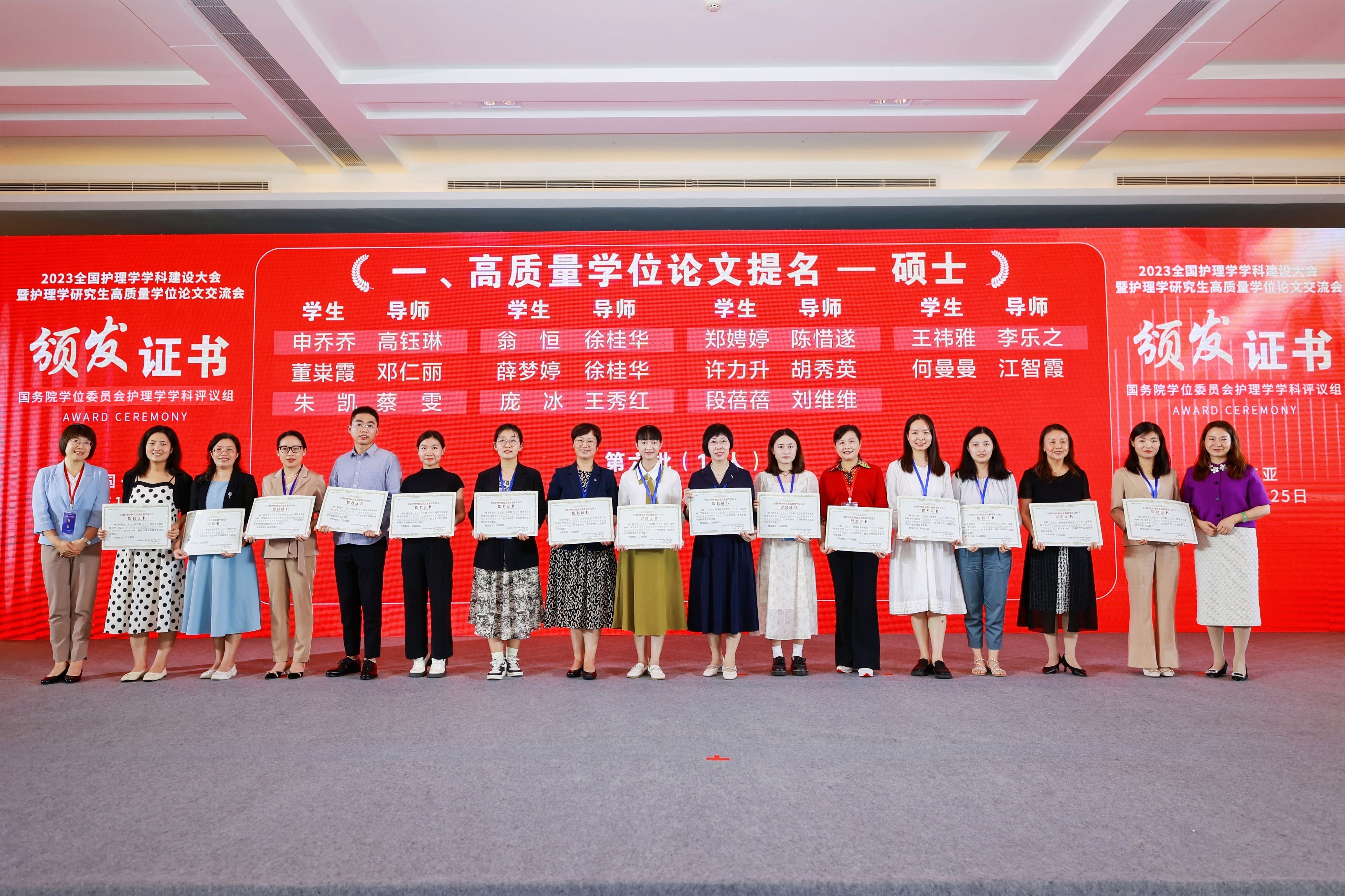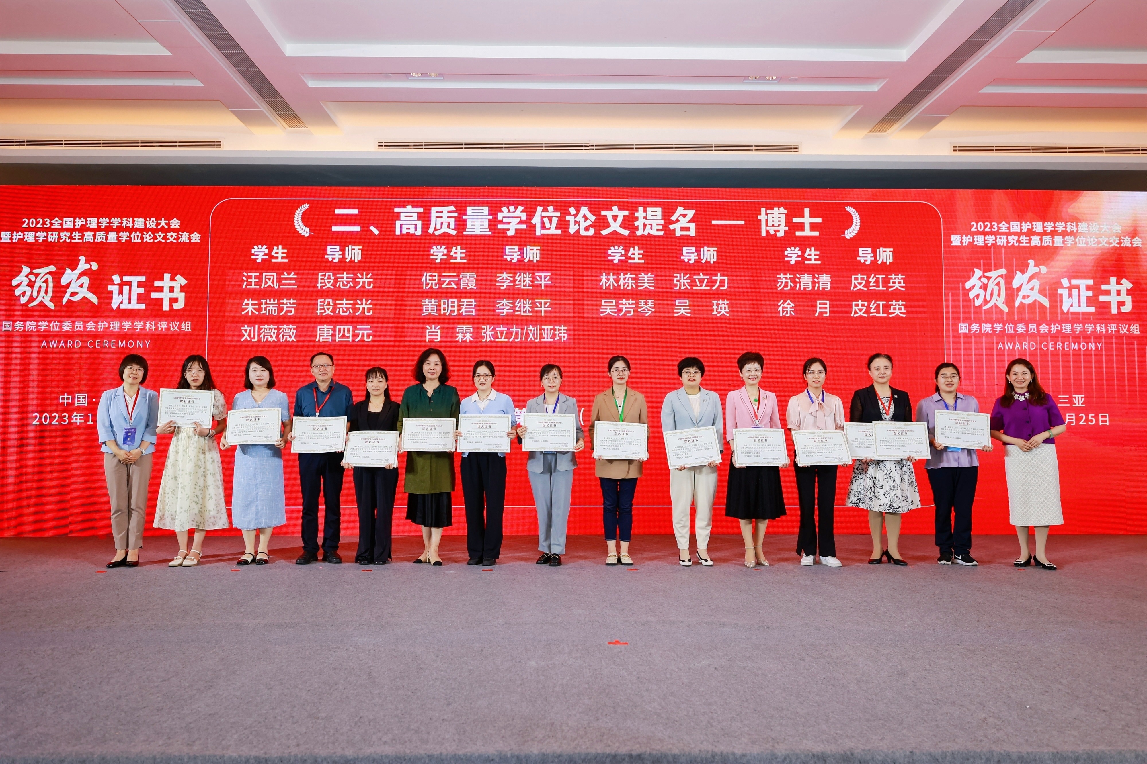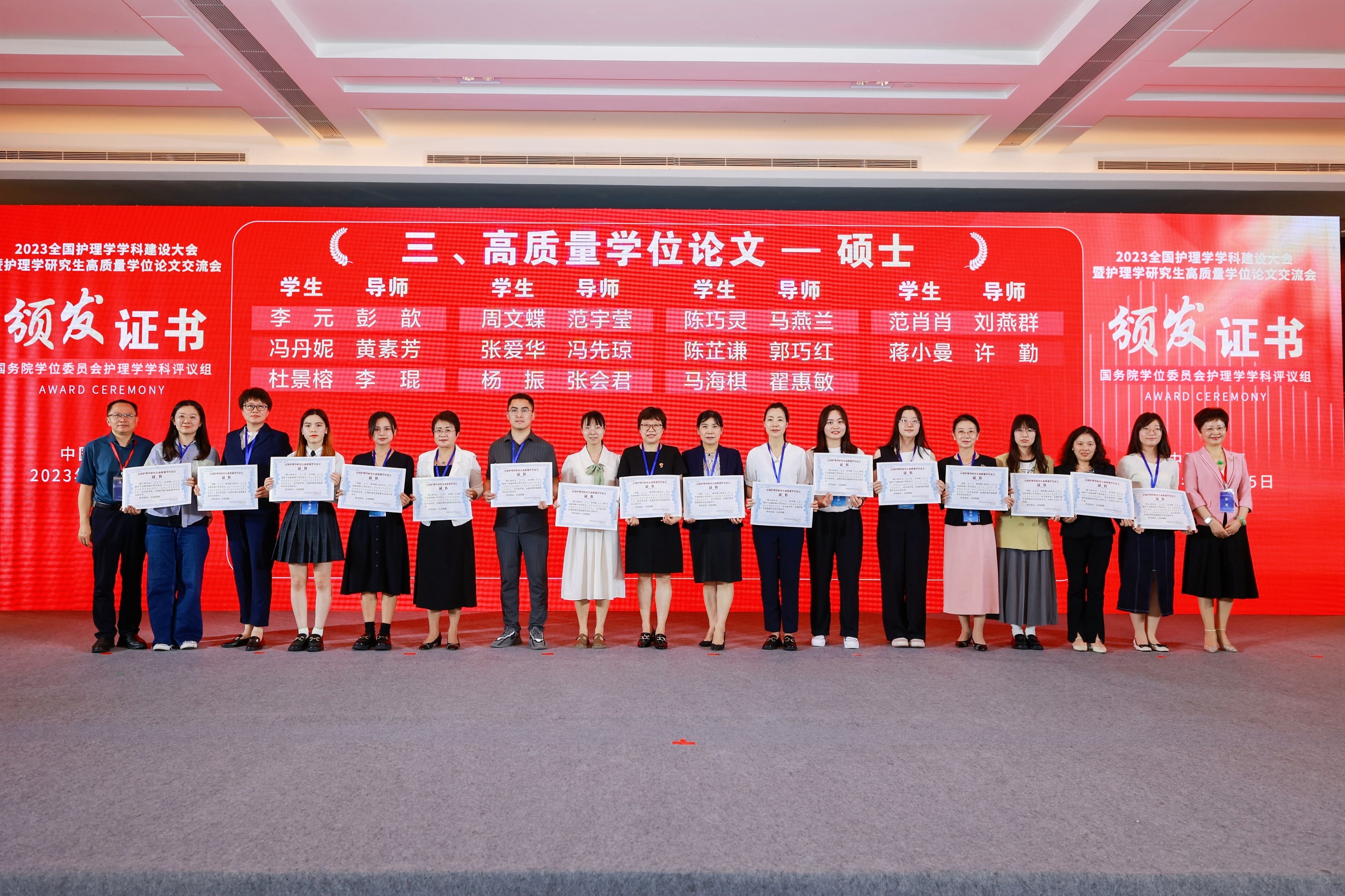 会上,国务院学位委员会护理学学科评议组公布了“高质量学位论文”评选结果并颁发证书,我院陈鑫容-李卡教授、张爱华-冯先琼教授获评“全国护理学研究生高质量学位论文”,黄明君/倪云霞-李继平教授、王丹-李卡教授、许力升-胡秀英教授、胡汝均-蒋晓莲教授获“全国护理学研究生高质量学位论文提名”。