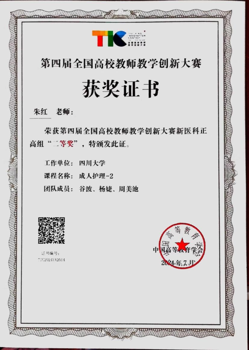 2024年7月31日,由教育部高等教育司指导、中国高等教育学会主办、电子科技大学承办的第四届全国高校教师教学创新大赛总决赛在成都落下帷幕。护理学院朱红教授代表成人护理学课程团队获得新医科正高组二等奖。这是继2021年我院妇产科护理学何菁菁老师团队、2022年儿科护理学陈琼老师团队在全国赛获奖后,我院再次在该大赛中荣获佳绩!