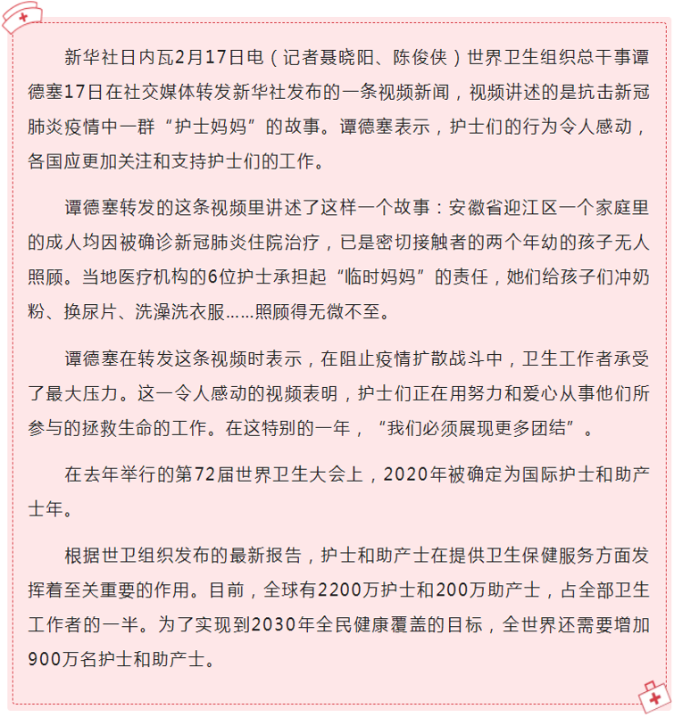 2月17日,世界卫生组织总干事谭德塞在转发视频新闻时表示,在阻止疫情扩散战斗中,卫生工作者承受了最大压力。这一令人感动的视频表明:护士们正在用努力和爱心从事他们所参与的拯救生命的工作……