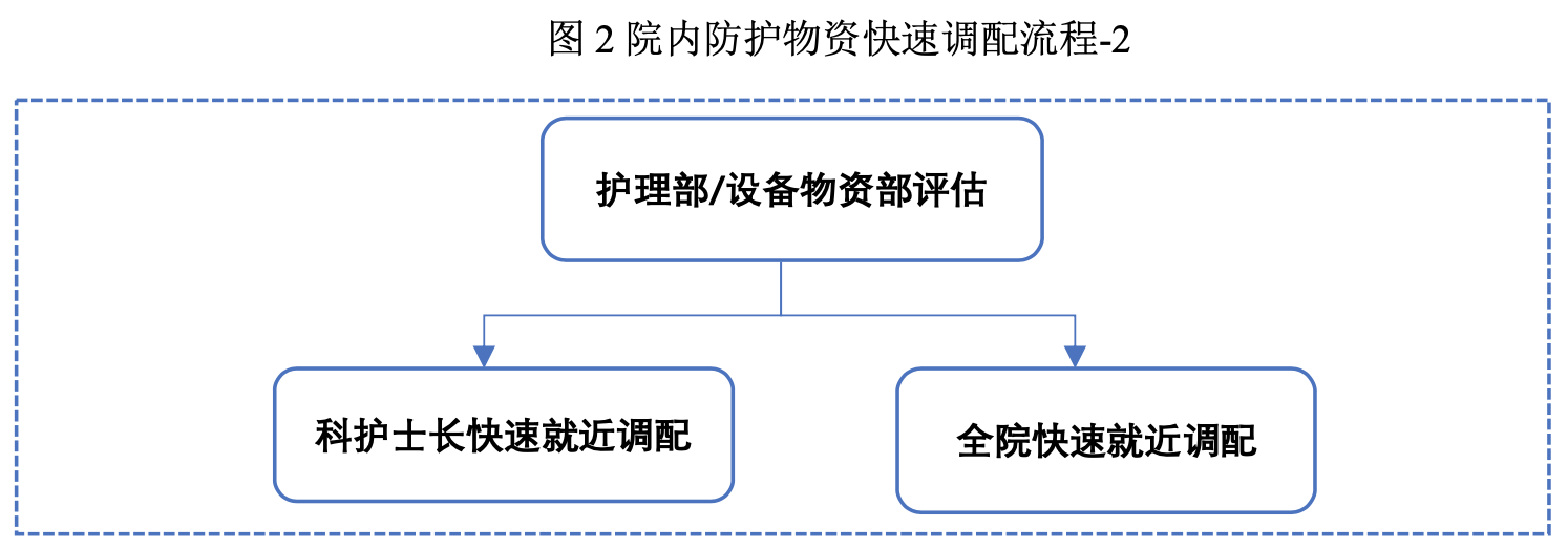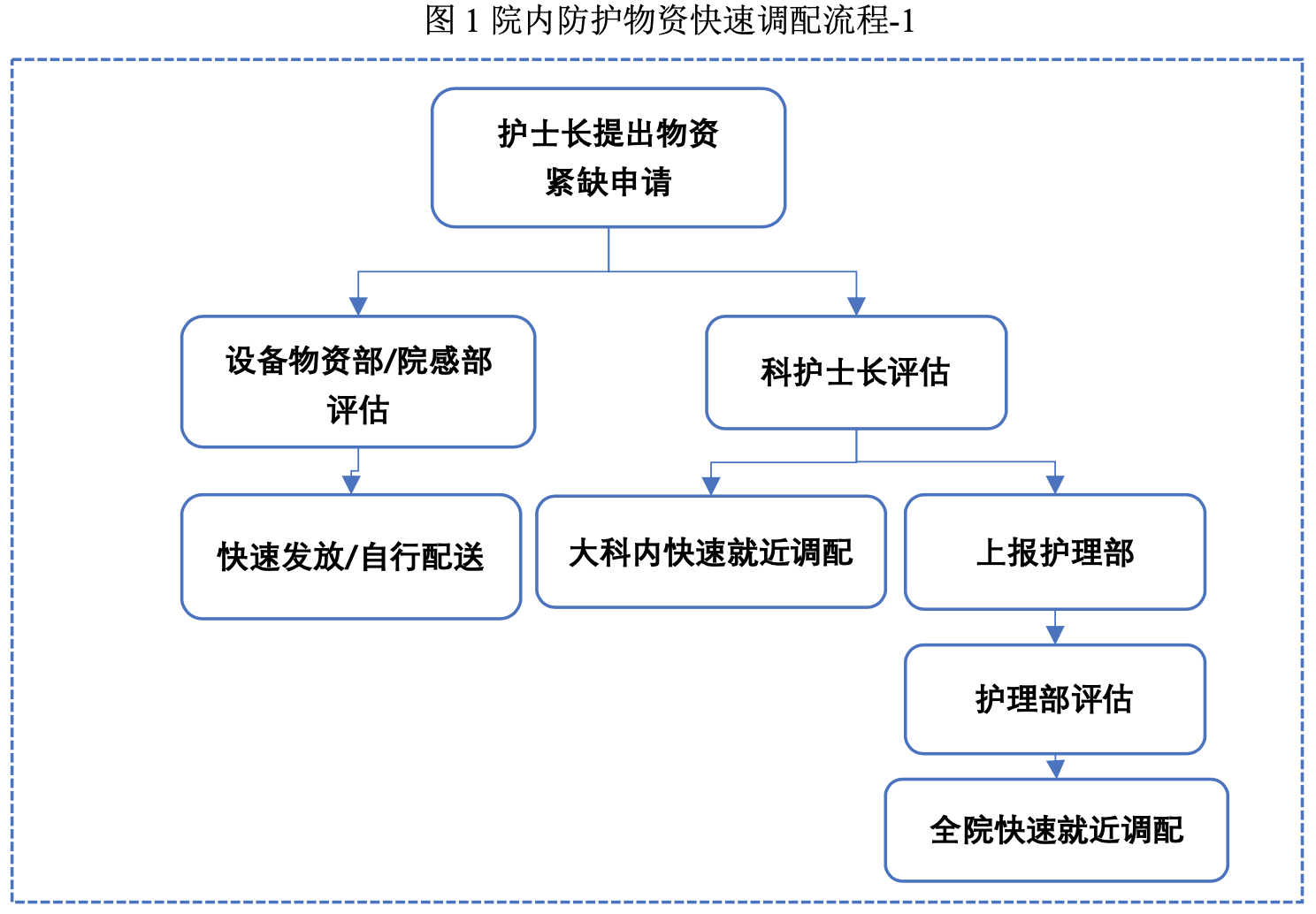 2. 院内综合调配:利用信息系统,掌握全院防护物资分布、使用情况,以便达到综合协调,统一管理,优先保证院内重点科室病人救治的顺利进行。具体流程见图1及图2: