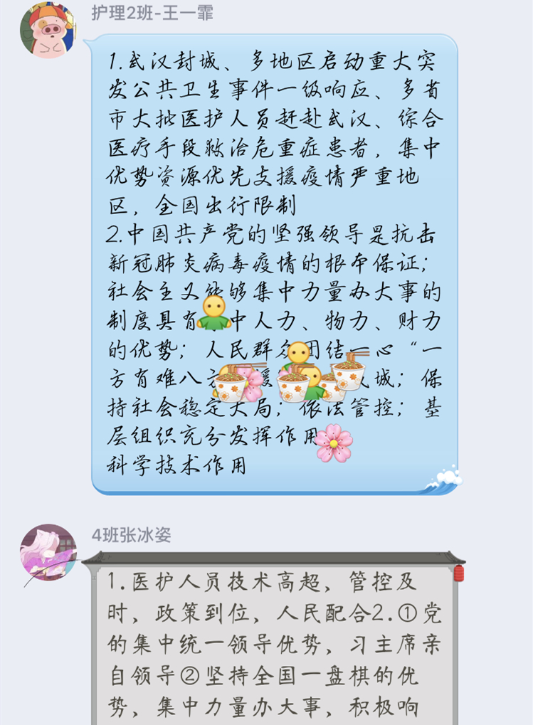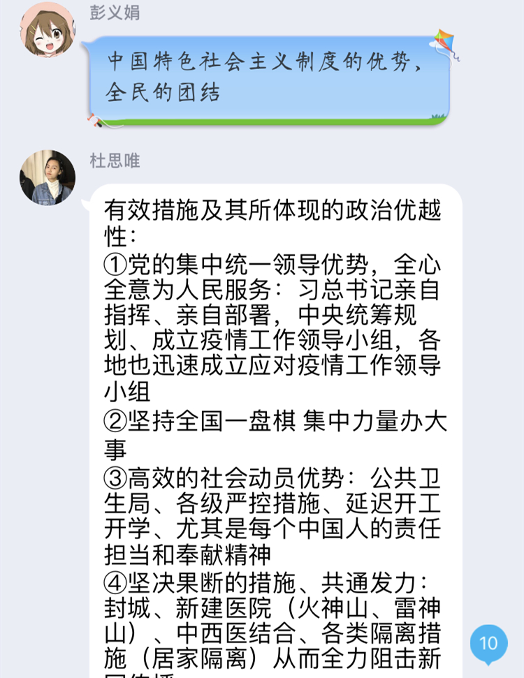 同学们学习后积极发表自己的感悟,认为习总书记亲自指挥、亲自部署,中央统筹规划、成立疫情工作领导小组,坚持全国一盘棋,集中力量办大事是疫情得以有效控制的重要保证。中国制度、中国模式、中国效率,让大家由衷感受到“此生无悔入华夏”的民族自豪感。