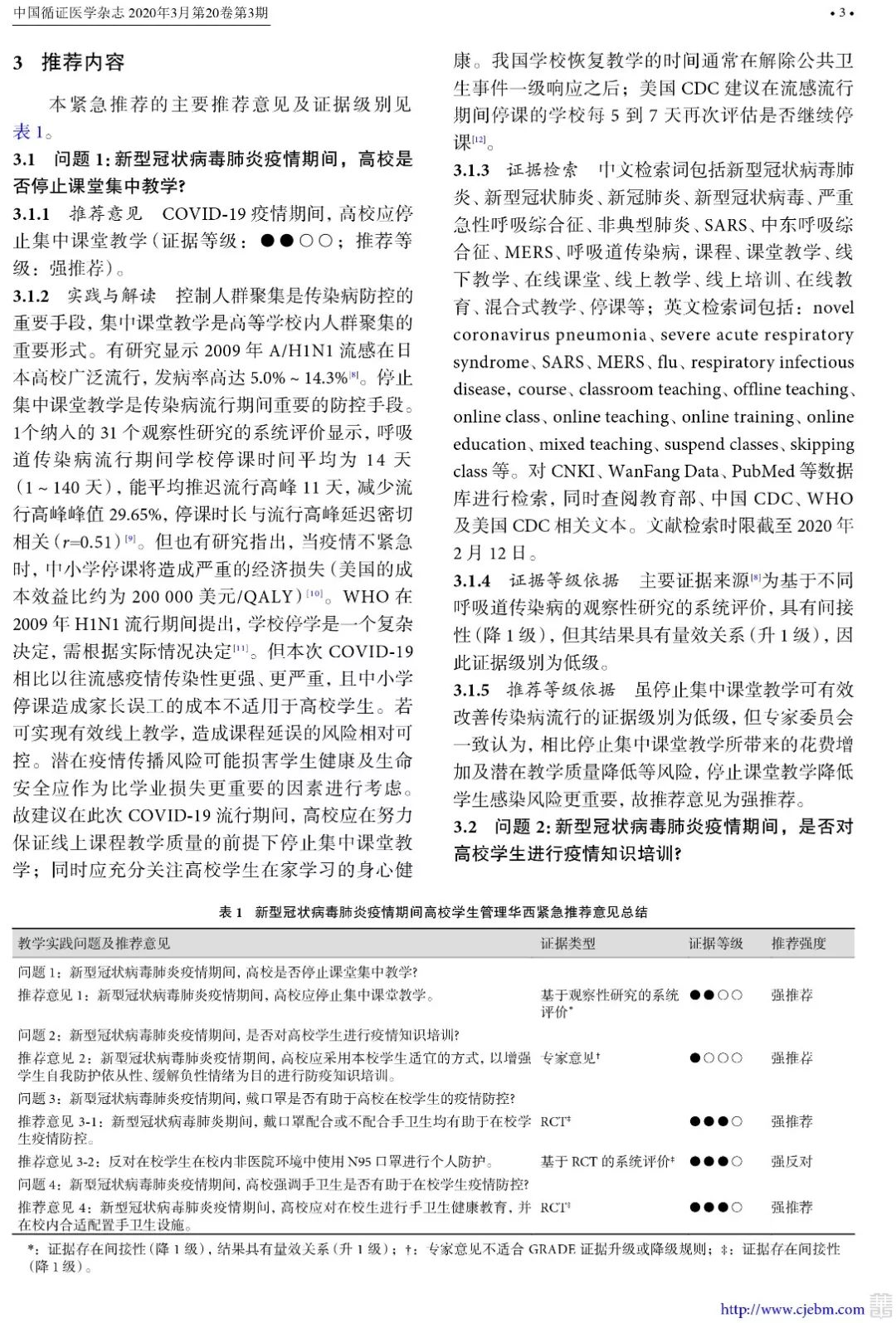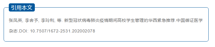 川大华西护理学联合临床医学、教育学、循证医学、公共卫生学等多学科专家采用循证医学方法,结合本次疫情实际情况,就高校疫情防控中的教学管理问题,在《中国循证医学杂志》发布紧急推荐,为新冠疫情防控期间高校学生管理提供借鉴参考!