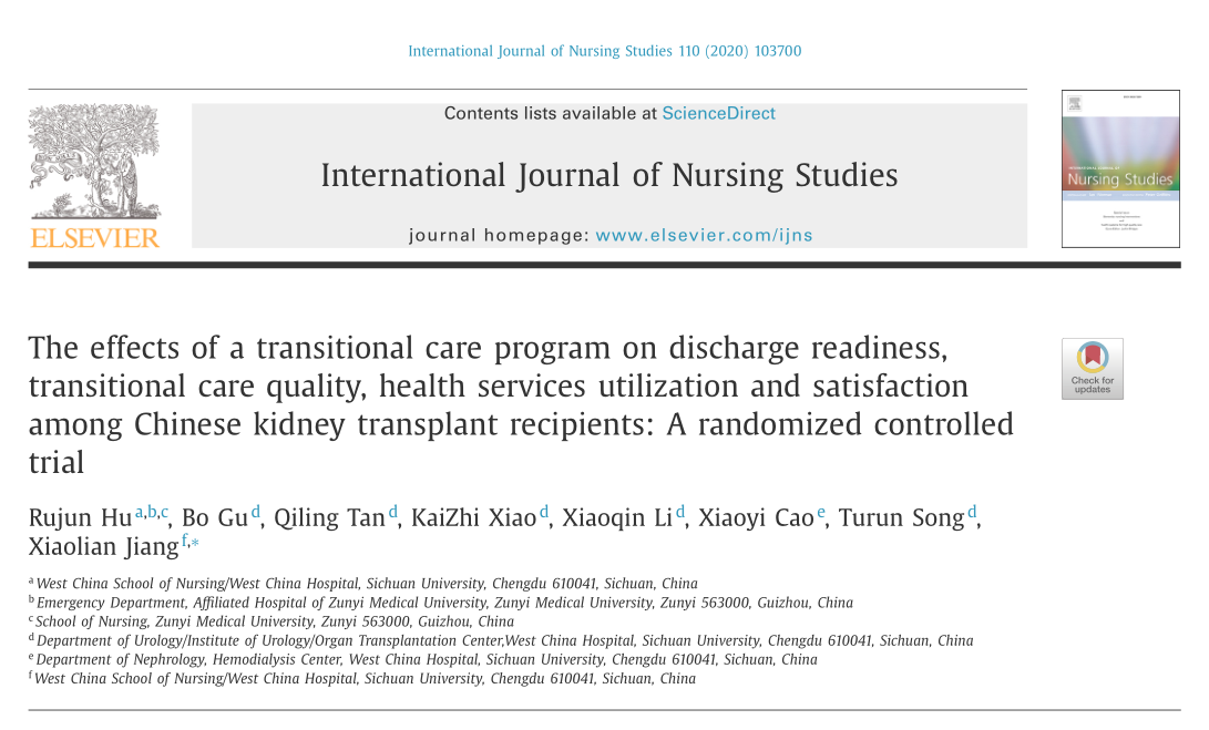 文章标题《过渡期护理项目对中国肾移植受者出院准备度、过渡期护理质量、卫生服务利用及满意度的影响:一项随机对照研究》《The effects of a transitional care program on discharge readiness, transitional care quality, hea...