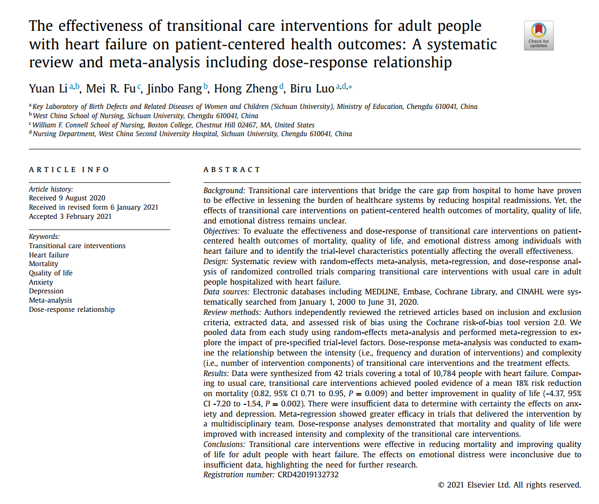 文章标题:《基于以患者为中心的健康结局指标评价过渡期护理干预对成年心衰患者的效果:一项包含剂量-反应关系的系统评价和荟萃分析》文章发表情况简介:第一部分:文章内容解读背景心力衰竭(Heart Failure, HF;简称心衰)是一...