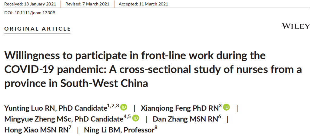 文章标题《COVID-19 大流行期间参与一线工作的意愿:对中国西南某省护士的横断面研究》《Willingness to participate in front-line work during the COVID-19 pandemic: A cross-sectional study of nurses from a province in S...