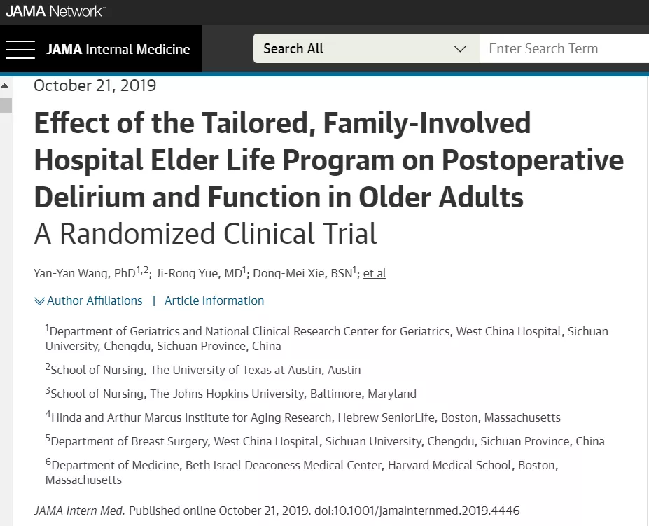 我院护理学博士、在站博士后王艳艳作为第一作者,老年医学中心岳冀蓉教授为通讯作者,在国际著名医学期刊JAMA Internal Medicine(IF=20.768)以原创性论著形式发表。该研究试验结果提出了更加符合我国国情的老年术后谵妄的个性化...
