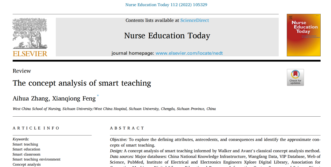 文章标题《智慧教学概念分析》《The concept analysis of smart teaching》文章发表情况介绍该文章由bat365中文官方网站硕士研究生张爱华为第一作者、冯先琼教授为通讯作者完成,于2022年5月在Nurse Education Today(影响因子...