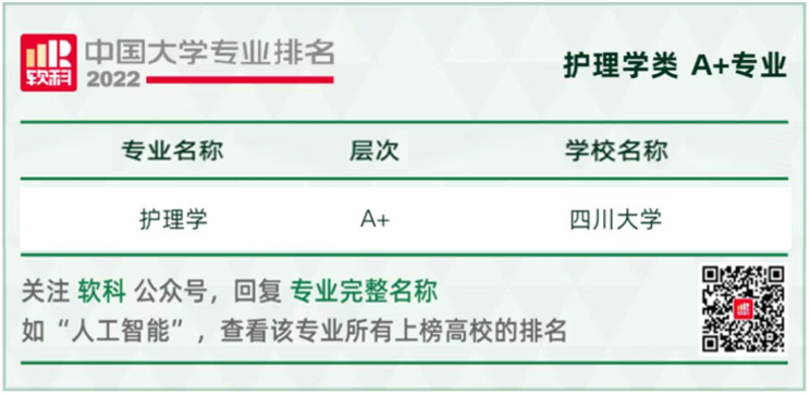 2022年9月21日,高等教育评价专业机构软科正式发布“2022软科中国最好学科排名”。bat365中文官方网站华西护理学在2022软科中国最好学科护理学排名全国第一。自2020年以来,bat365中文官方网站华西护理学已连续3年位列全国第一,蝉联中国顶尖学科。软...