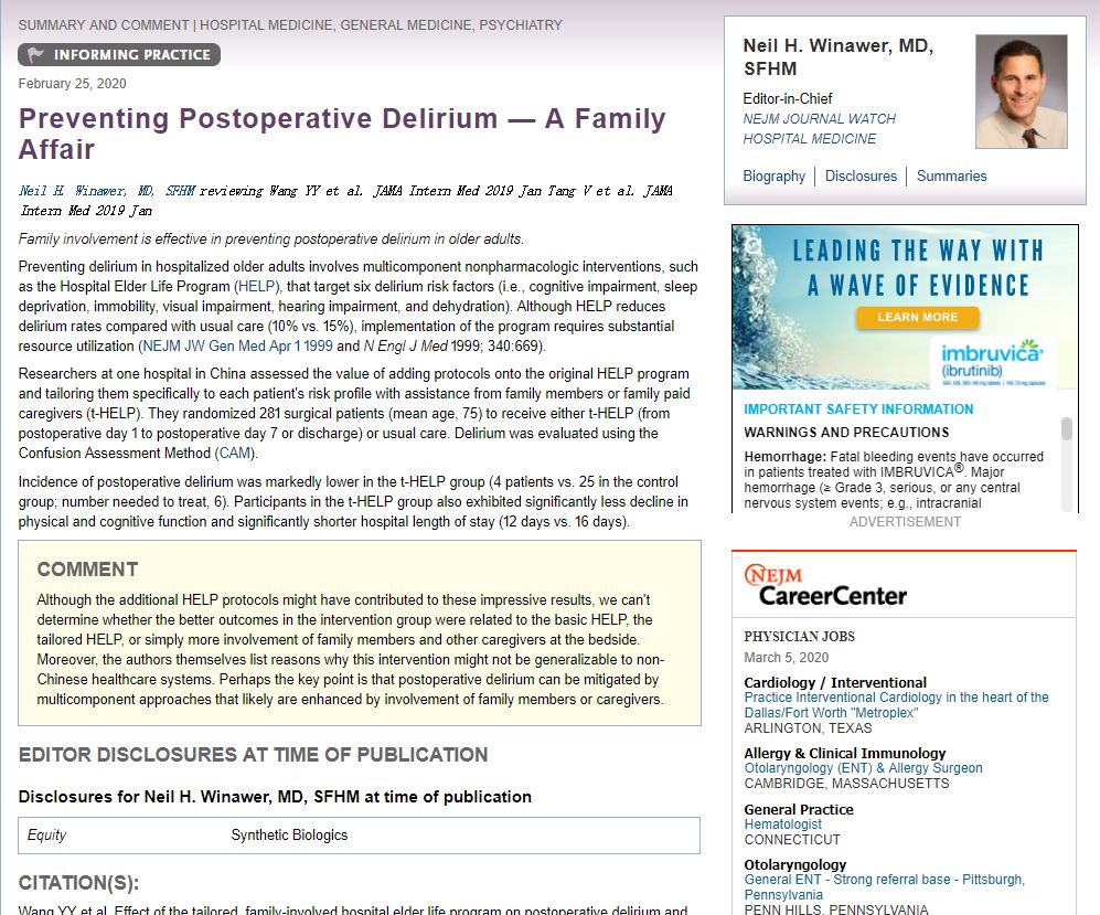 近日,NEJM Journal Watch 杂志主编Dr. Neil H. Winawer 针对我院发表于JAMA Internal Medicine 的原创论著 《Effect of the tailored, family-involved hospital elder life program on postoperative delirium and function in ...
